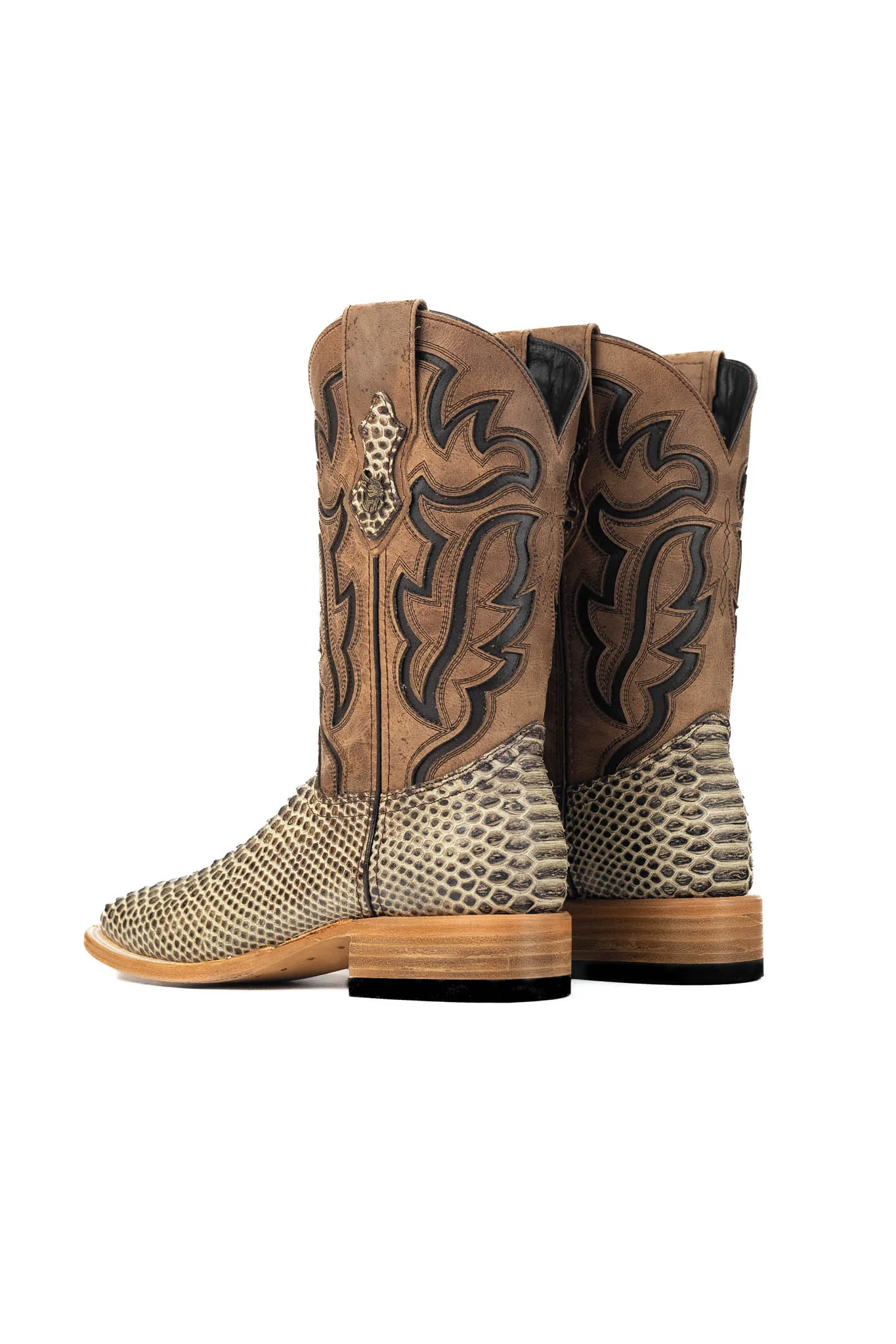 The Bruce cowboy boots are Made in Mexico from Genuine Leather. They feature a square toe and a Python print vamp, available in various colors. The shaft, also available in different colors, is crafted from distressed leather with intricate flame-like inlays for a rugged yet stylish look. A Rock'em bull’s head emblem on the pull straps adds a signature Western touch. The boots have a durable leather sole with a rubber heel for stability, a double-stitched welt for durability, and a natural-tone bottom sole that enhances their refined, versatile aesthetic.