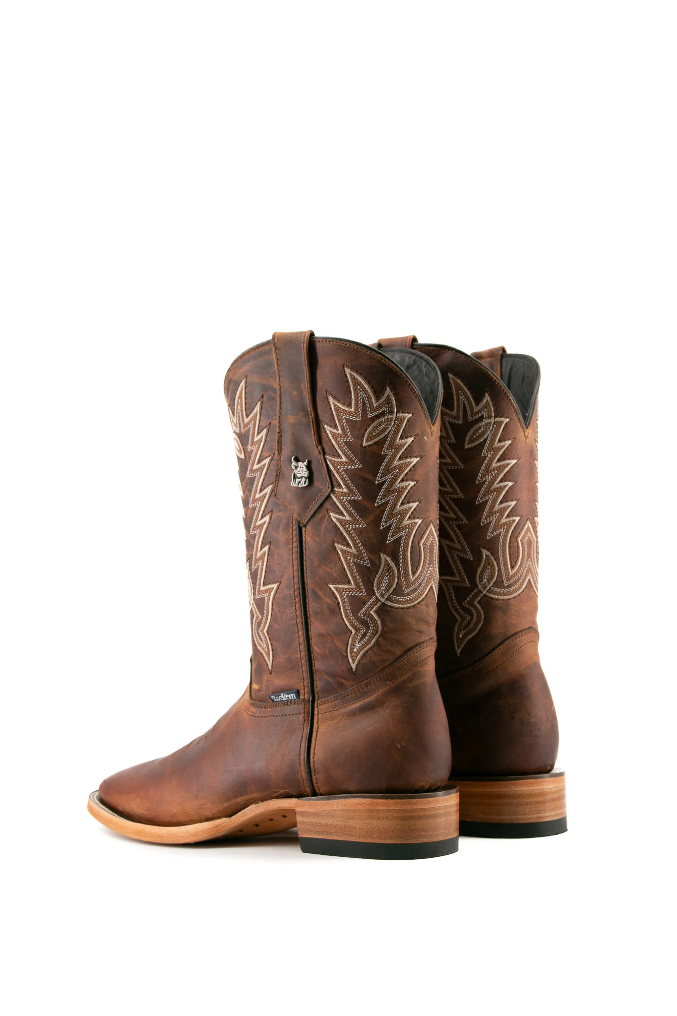 The Heritage Ebano cowboy boots are Made in Mexico and crafted from genuine leather. They feature a square toe design and a smooth leather shaft, intricately stitched with an elaborate embroidery pattern. A small metallic emblem of a Rock'em bull's head on the pull straps adds a signature Western touch. The boots have a durable leather sole with a rubber heel for comfort and stability, featuring a double stitched welt for enhanced durability.