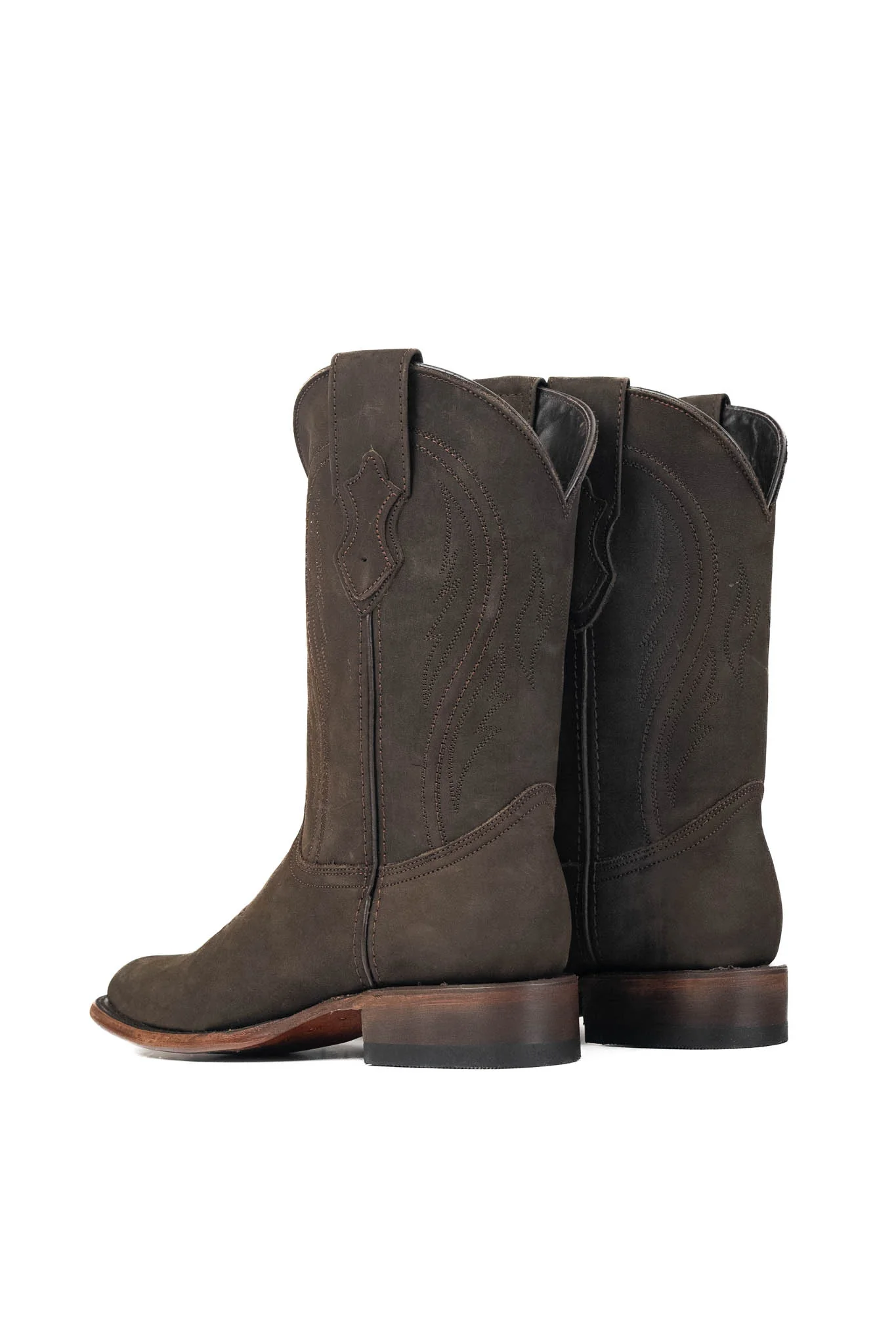 The Daryl Nobuck Round Toe Cowboy Boots are handcrafted in Mexico from genuine leather, featuring a classic round toe and a smooth Nobuck leather finish. The shaft is detailed with intricate stitching. A small metallic emblem of a Rock'em bull's head on the pull straps adds a signature Western touch, while sturdy leather pull straps ensure easy wear. A stitched welt enhances durability, and the design is built for comfort and longevity. With leather stacked heels, a leather sole, and a rubber heel, these boots seamlessly blend timeless Western craftsmanship with modern functionality.