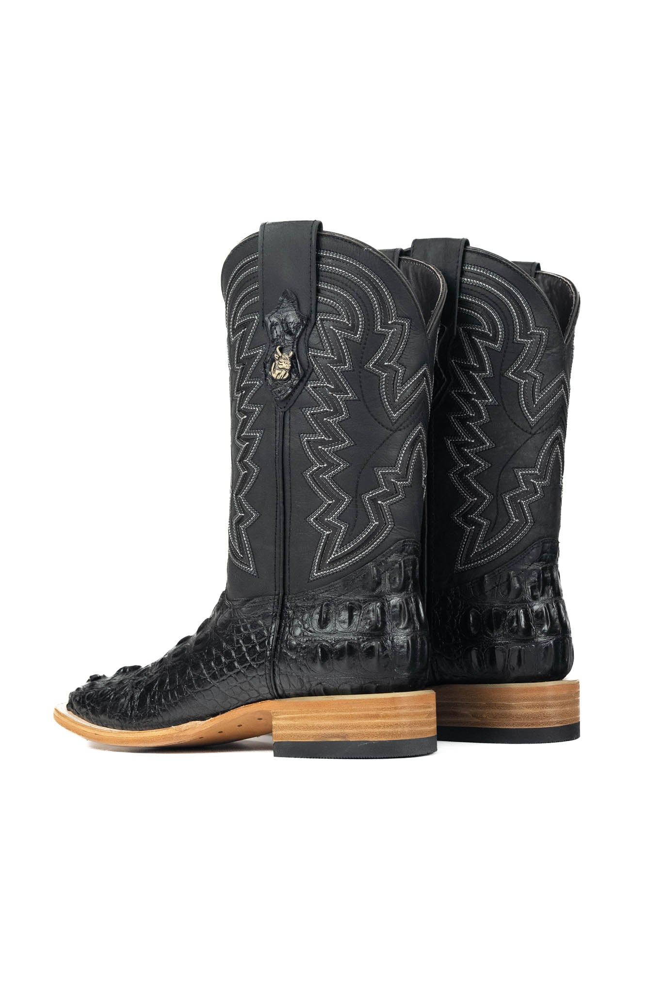 The Jameson cowboy boots are Made in Mexico and crafted from Genuine Leather. They feature a square toe design and a bold Caiman Leather texture on the vamp, available in various colors. The shaft, made of smooth leather, comes in different shades and is intricately designed with a zigzag stitch pattern for a striking look. A small metallic emblem of a Rock'em bull's head on the pull straps adds a signature Western touch. The boots have a durable leather sole with a rubber heel for comfort and stability, featuring a double-stitched welt for enhanced durability, while the natural-tone bottom sole complements their rugged yet sophisticated aesthetic.